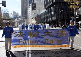 开路的天国乐团一路上演奏《法轮大法好》、《法正乾坤》、《佛恩圣乐》等一首首庄严的乐曲。随后是上百名法轮功学员手持“法轮大法好”、“真善忍好”、及法轮大法洪传世界各国的横幅。
