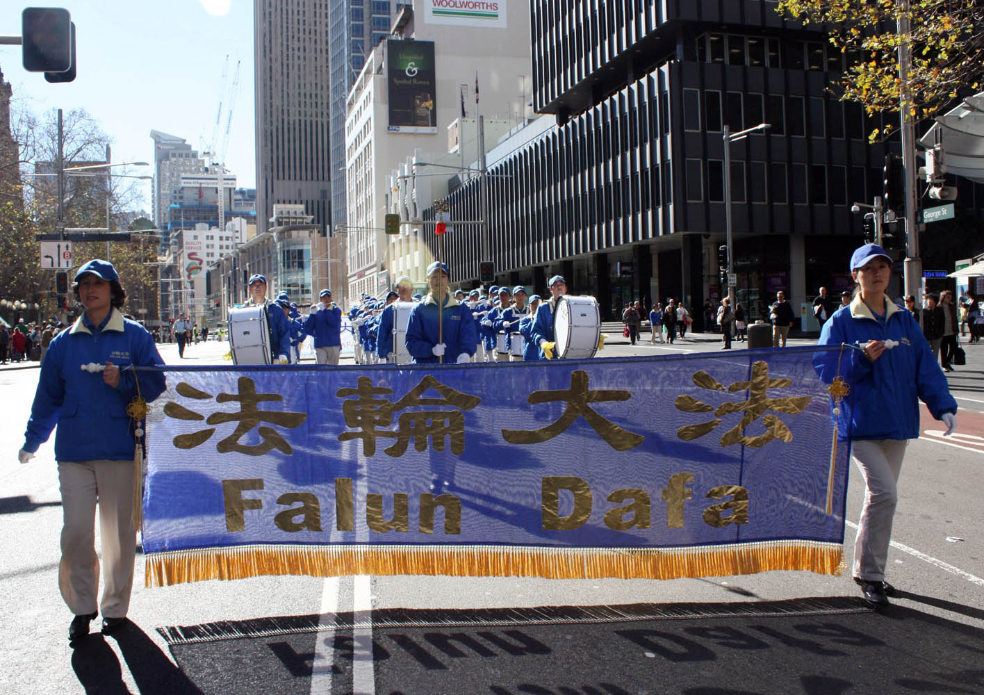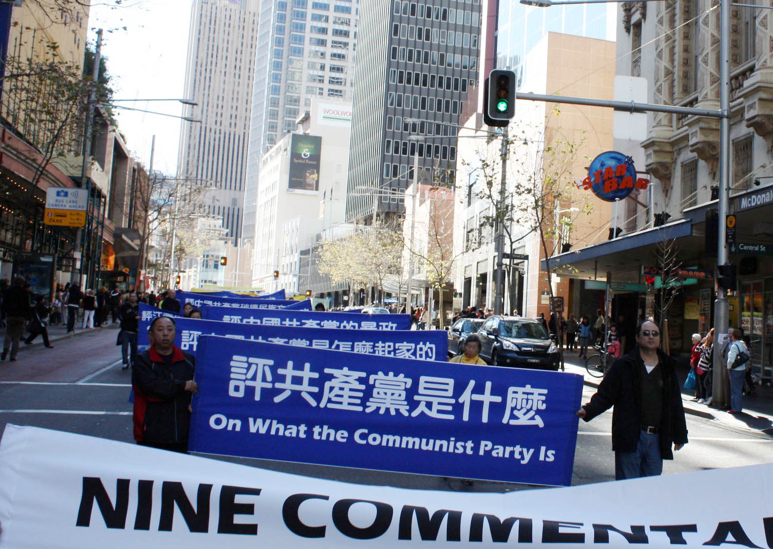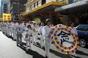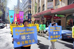 游行队伍从悉尼市政厅出发,以天国乐团开路,由“法轮大法洪传世界”、“和平非暴力反迫害历程”及“·九·评*共产党引发退!党!大潮”三大部份组成,呼吁善良民众伸出援手,共同结束中共对法轮功的迫害。