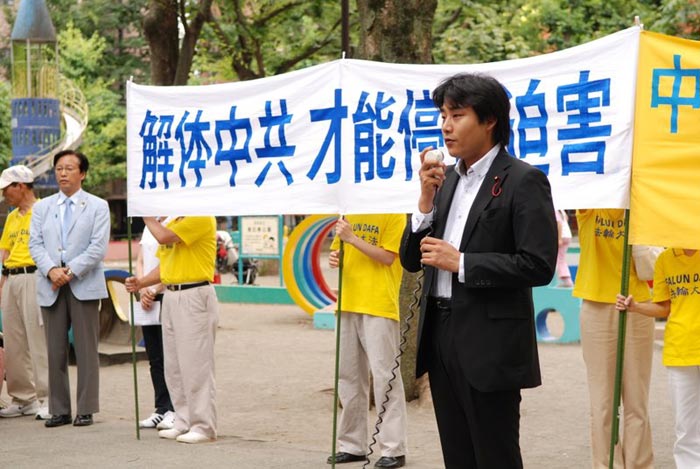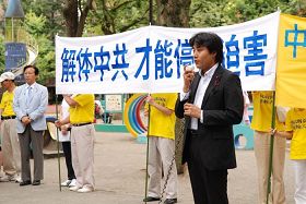 在日华人,日本中文媒体《新华时报》主编苏灵在集会上发言表示,良知驱使他站出来讲话。看到法轮功学员在中共使馆前十年如一日和平抗议,他认为,出于信仰的力量,他们才能做到,不能小看信仰的力量。苏灵说,“我们每个人信仰什么是一回事,要保障他,更重要的是我们要维护每个人信仰的权利。今天有人迫害法轮功的时候,不管你是不是法轮功,我们都有这样的权利,都有这样的义务,都应该站出来说话。我可以不信仰你的信仰,我也可以不同意你的某些观点,但是我要维护你的权利。因为只有这样,我们整个信仰的自由得到保障的话,我们的社会才是一个自由的、民主的、进步的社会。所以我不希望有哪一天中共迫害到法轮功以外的我们同胞的身上来,迫害到我的身上来,所以我要维护法轮功学员的权利。”