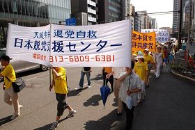 集会之后法轮功学员开始从位于繁华市区的惠比寿公园到青山的约两个小时的游行,虽然天气炎热,因为是公共假日的最后一天,街上依然行人众多,也有来自其它国家的观光客。记者看到人们被眼前出现的这支队伍吸引,对天国乐团的演奏耳目一新,纷纷以游行队伍为背景拍照摄像,看着法轮功学员遭受酷刑的展板及身穿白衣手捧被迫害致死同修遗像的方阵表情凝重,默默无语。许多人仔细阅读接到的法轮功真相单张,有的人询问更多情况。