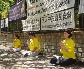 法轮功学员在中使馆旁抗议迫害 |