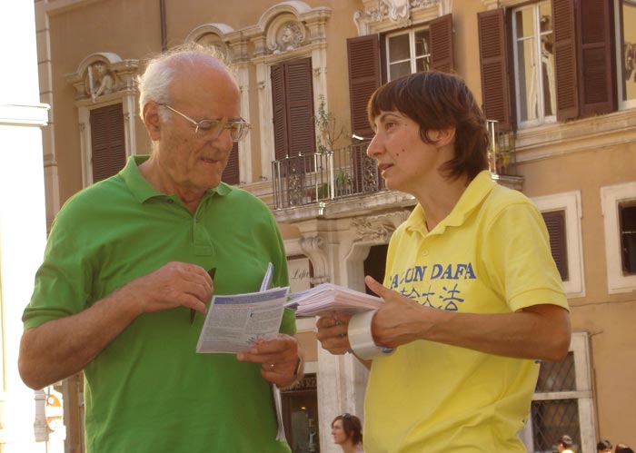 法轮功学员在意大利国会前向路人 |