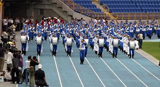 ![]() 二百五十多位法轮功学员所组成的天国乐团引领历年的台湾田径金银牌选手入场。 |