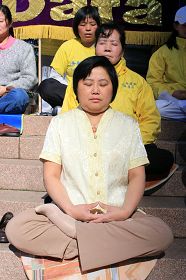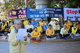 ![]() 法轮功学员华裔画家章翠英女士在高院前的皇后广场上 |