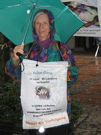 六十九岁的德国法轮功学员克里米德(Kriemhild)为了更好的讲述真相,在身上挂了一个小条幅,上面写着“法轮功弘传世界”和“停止迫害法轮功”等文字。她说:“十年中,这么多好人被迫害是一件很可怕的事情。中共要把它的思维强加给中国人,而法轮功是叫人做好人,来去自由,没有人约束你,给你压力,全都是自由的。仅仅从这一点上来说,迫害就是不应该的。发生在中国的迫害经常使我想起我们西方历史中基督徒被迫害的情况。”