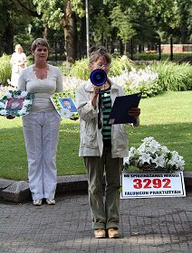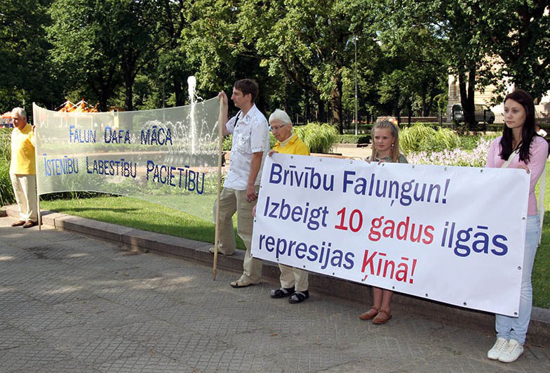 上午九点,法轮功学员来到中共驻拉脱维亚使馆前抗议,并集体炼功。中午,学员们在首都里加的市中心举行集会,呼吁善良的人们帮助制止中共对法轮功持续十年的迫害。很多里加市民了解了真相,表达了对因坚持信仰而遭受中共迫害的法轮功修炼者的支持。