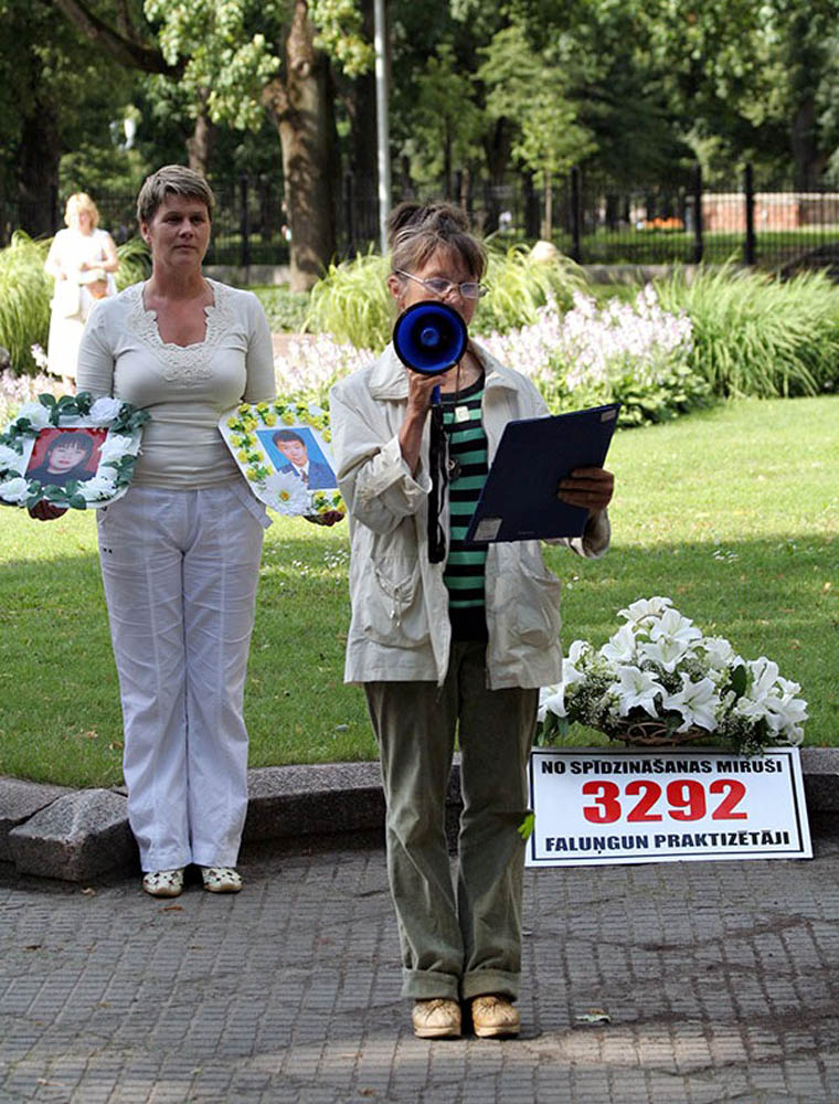 集会后,法轮功学员举行了游行,从里加市中心一直走到中共使馆。晚上,他们在中使馆前进行了烛光守夜活动,悼念十年来被中共迫害死的中国大陆法轮功学员。