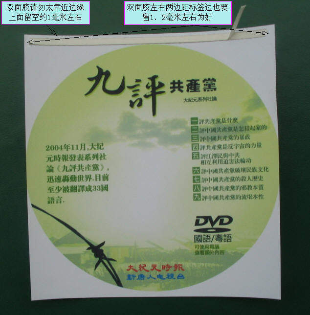晚会光盘标签入袋粘贴时,请同时留心纸袋的质量,那些有明显斑点、皱褶或破损等的不良纸袋请不要用来装晚会光碟为好。(有些纸袋上的杂质、斑点用刀片轻刮便可清除)