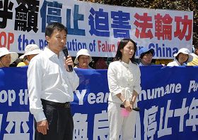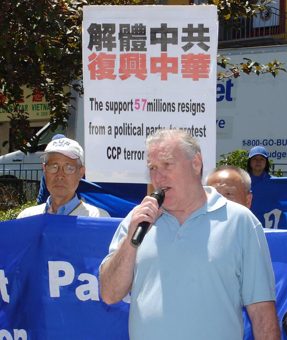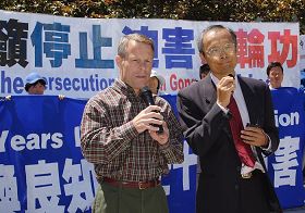 旧金山市议员克里斯·戴利特别来到会场。他说:“我怀着悲痛的心情来到这里,因为我想到十年来在中国大陆被迫害的法轮功学员。同时我也感到欣慰,中国的法轮功学员那种坚忍不屈的精神令我敬佩。作为法轮功的朋友,我可以告诉大家,法轮大法好!真善忍的原则,我们不光要信奉,而且要传给所有的人。我们要谴责所有迫害法轮功的暴徒。在旧金山市政厅,我永远都为你们发言!”