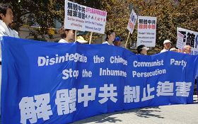 几十位法轮功学员手举着“制止迫害法轮功”、“解体中共 停止迫害”、“声援五千七百万中国人退出中共恶党”、“天灭中共 天佑中华”等中英文横幅和标语牌。学员们还沿途向民众分发真相传单,呼吁民众关注迫害,伸出援手,共同制止这场达十年之久的浩劫。