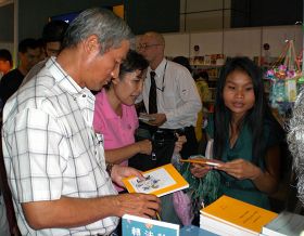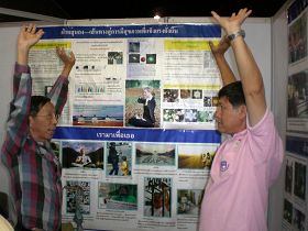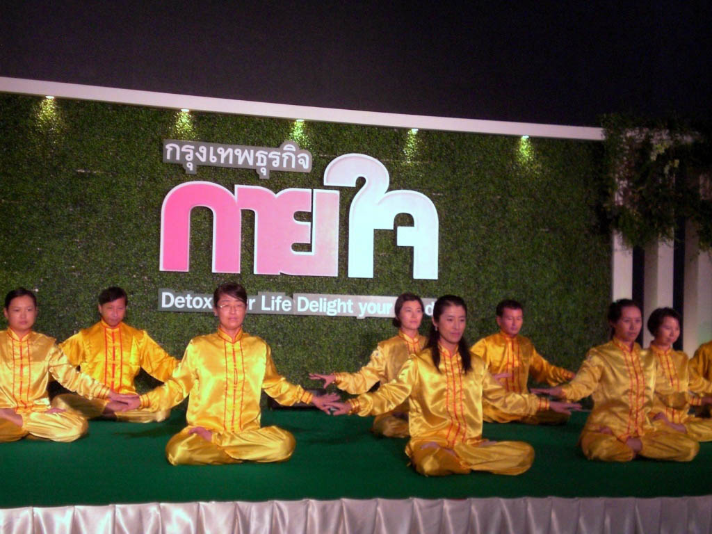 博览会开始时,法轮功学员的展位上挂着“法轮大法好”的金色灯笼,布置了世界各地的炼功图片、揭露中共迫害法轮功的真相展板,还有当地丰富多彩的洪法图片等,桌上摆放着中泰文《转法轮》《·九·评*共产党》、法轮功真相光盘、等资料,播放着优美的炼功音乐。祥和的气氛吸引了许多参观者到展位前询问讯息,索取资料,以及了解中共打压法轮功的真相。
