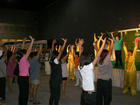 当身穿金黄色炼功服的法轮功学员,整齐地上台演示五套功法时,给会场带来一片祥和宁静。台下很快站满了跟着学炼的人群。人们从法轮功学员的讲解中,明白了法轮功是按照“真善忍”的法理修炼。