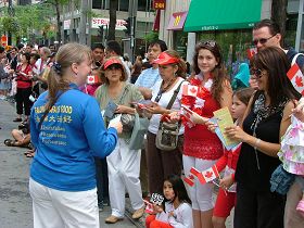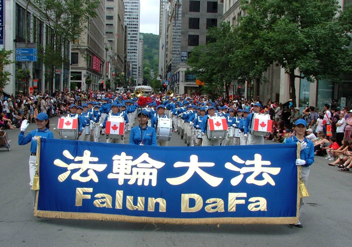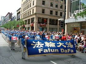 身着印有“法轮大法好”和“真善忍”字样的蓝色T恤,来自纽约和蒙特利尔超过百名法轮功学员组成的天国乐团的队伍,是本次游行中一道亮丽的风景线。天国乐团沿途一遍遍演奏《法轮大法好》、《法鼓法号震十方》、《法正乾坤》、《送宝》、《法轮圣王》和《永远的枫叶》等曲目。乐团所到之处,引来道路两旁观众的阵阵欢呼声和掌声。随着乐团行进,学员将介绍法轮功的传单递给观众,许多人迫不及待地从传单上寻找更多的法轮功信息。