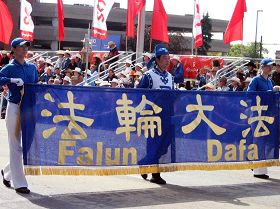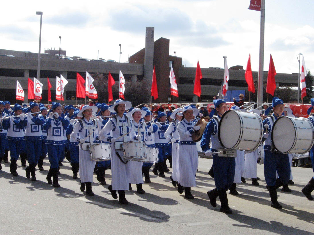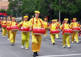 法轮功学员今年已是第三次参加牛仔节大游行,除传统的仙女、花车、唐鼓外,近百人组成的天国乐团在当地首次亮相,惊艳全场。蓝白相间的仿宋制服,纯净柔和,“法轮大法好”的乐声令人心生向往。尽管参加游行的乐队有数十支之多,红黑黄靛,千姿百态,热闹非凡,但天国乐团超俗的气质与众不同。