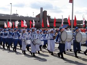 殿后的是唐鼓队。法轮功学员的唐鼓队也是长达三小时的游行中唯一一支鼓声从未间断的队伍,铿锵昂扬,祛邪镇恶。