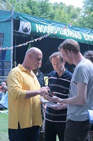 一位游客来到帐篷前向学员表示:自己也在练气功,看到学员们的功法演示,对法轮功产生了浓厚的兴趣。因为看到展板的介绍,他询问了法轮功学员在中国被迫害的情况。 随后详细询问了第五套功法——神通加持法和大法书籍《转法轮》,还交流了他对修炼的专一和吸烟的执著的认识。一名学员向他谈了自己的修炼体会——得法后戒掉了三十年的吸烟习惯等。听到学员的亲身修炼体会,这位游客表示他现在所练的离自己所期望的相距甚远,他将上网阅读大法的书籍,希望借此能够找到更高层次的修炼方法,并期望受益于法轮大法。