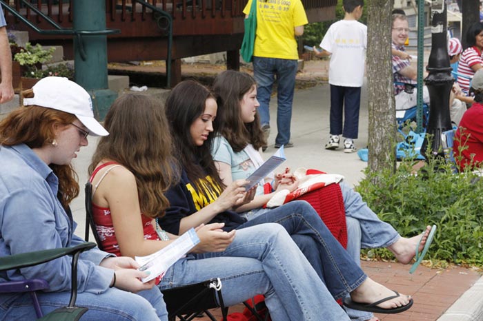 两旁的观众高兴地接过法轮功真相资料,并认真阅读 |
