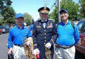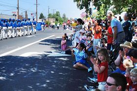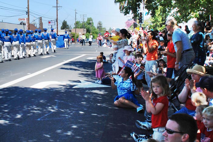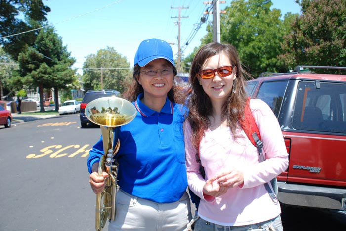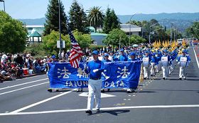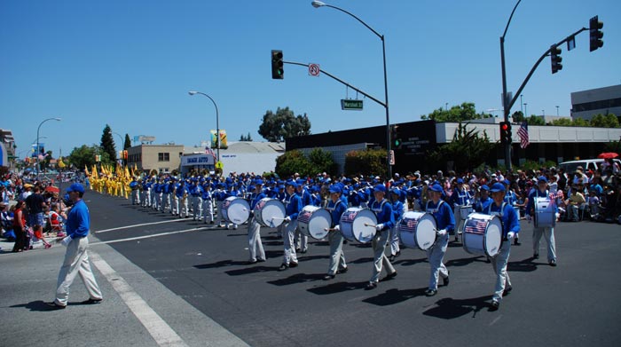 共有一百六十多支队伍参加了一年一度的北加州红木城庆祝美国独立日大游行。由法轮功学员组成的天国乐团,作为唯一的华人军乐队,受到全场的注目。他们精神饱满的演奏了《法轮大法好》、《法鼓法号震十方》、《法正乾坤》、《送宝》、《佛恩圣乐》,还有民众熟悉的《美丽的美利坚》等。每当一曲结束,两旁的观众都会爆发热情的掌声和欢呼声。