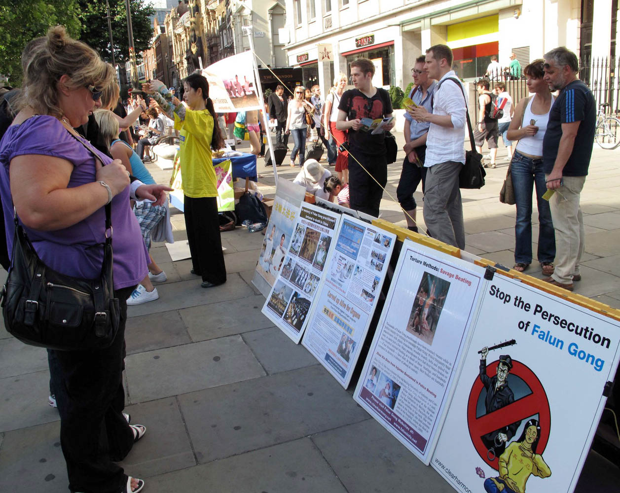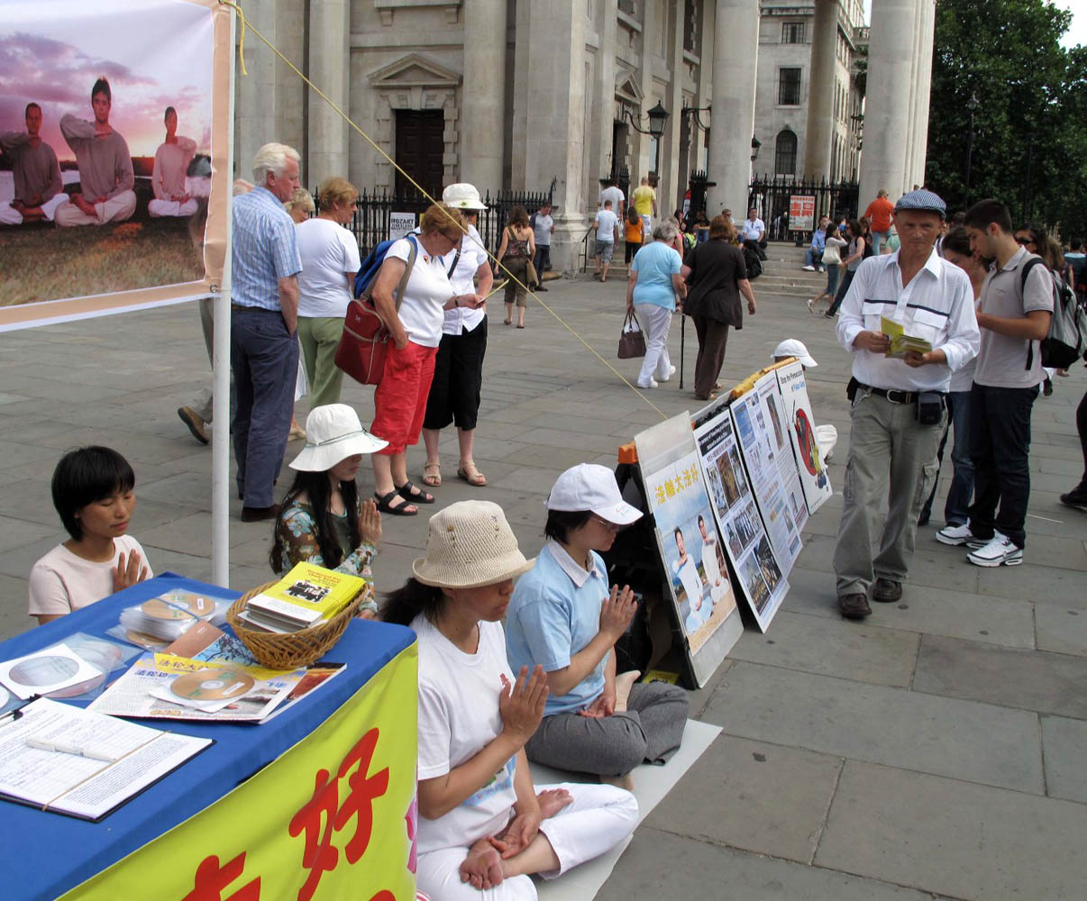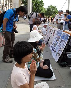 【明慧网二零零九年七月五日】(明慧记者唐秀明英国报导)二零零九年七月四日星期六,英国法轮功学员再次来到位于伦敦市中心的圣马丁小广场举办活动,希望让更多的人有机会感受法轮功、了解真相。与以往一样,参加活动的法轮功学员在六个小时的时间里持续不断的炼功、分发真相传单、面对面向人们讲述中共对法轮功的残酷迫害事实并征签谴责迫害。由于邻近的鸽子广场上正在举办一个世界性的集会,当天在圣马丁小广场经过的人流非常大。这些来往过客们来自英国各地、世界各地,很多人今天在这里第一次听说法轮功,但希望了解法轮功真相、签名声援反迫害的人非常多。