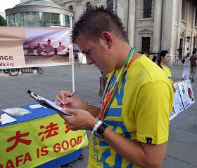 一群一群的英国中学生从活动现场走过。其中一组学生开始时对正在炼法轮桩法的学员不太礼貌。一位学员上前善意地告诉他们:请严肃一些,在中国,人们正在因为炼这样平和的功法而被迫害致死。听到这句话,学生们立即安静下来,其中一个女孩非常诚恳地向学员说抱歉,并向同伴们说:“听到了吗?在中国炼这样平和的功法会被受迫害。”另外一个男孩,在同伴们离开时,主动拿起征签表签字。