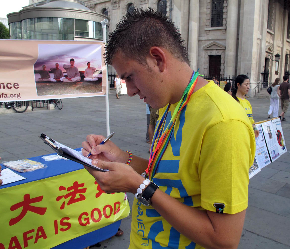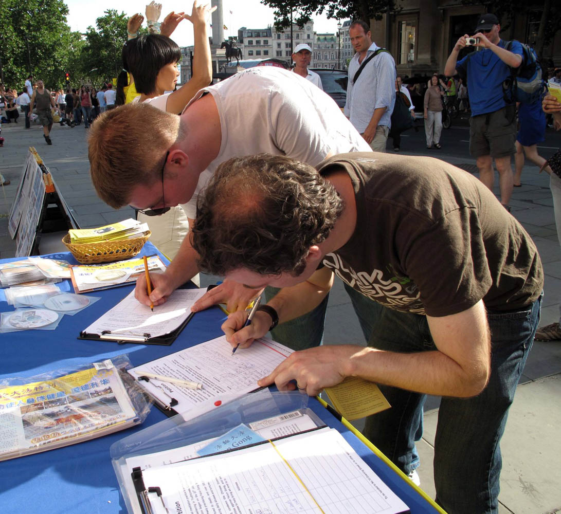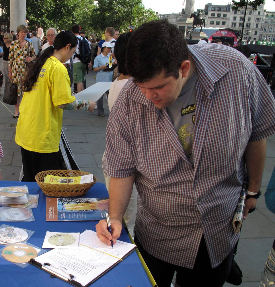 另一位英国小伙子乔那森(Jonathan)也在仔细阅读真相展板,看到记者,他抬头说:“摘器官卖钱,这太可怕了!”他接着告诉记者他相信这些,因为他有一个表兄,是个在中国工作的美国人,曾在中国因为进入了中共不对外开放的地区被非法关押了一段时间,而他被关押的时候家人谁也不知道他的下落,“那真是政府想把你怎么样就怎么样。”乔那森还告诉记者他非常赞赏法轮功学员向公众讲真相的努力。随后他主动到信息台桌前签字谴责中共迫害法轮功。