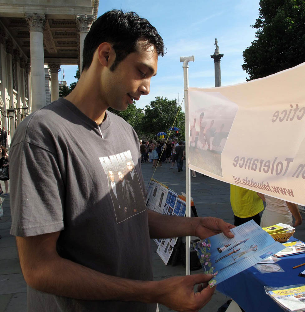 萨尔姆(Sharm)是位有印巴血统的英国青年,看到他在签名谴责中共迫害法轮功后还在认真看法轮功真相展板,记者走上前去问他是否了解为什么法轮功被迫害。小伙子很自信地说:“(中共)他们不想让人有信仰,因为他们要控制别人的思想。可以想象他们的确害怕,因为世界在变,人们总会知道该知道的。就象身体里的能量流动,你想阻挡是阻挡不了的。”说到这,萨尔姆又告诉记者他练气功,所以非常有兴趣了解法轮功,回去要上网去进一步查询。