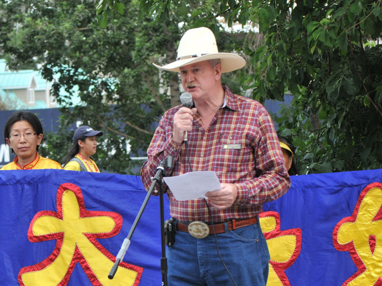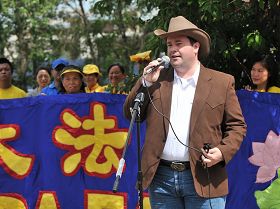 杰森•肯尼在集会上首先说:“卡城的牛仔节是庆祝加拿大西部文化的节日。西部文化的牛仔精神深植于对自由的追求。”他为在北美的法轮功学员来参加牛仔节活动而高兴,“你们在这里没有任何恐惧地参与各种活动,应该感谢加拿大给予我们的宗教自由、言论自由、结社自由和出版自由。”