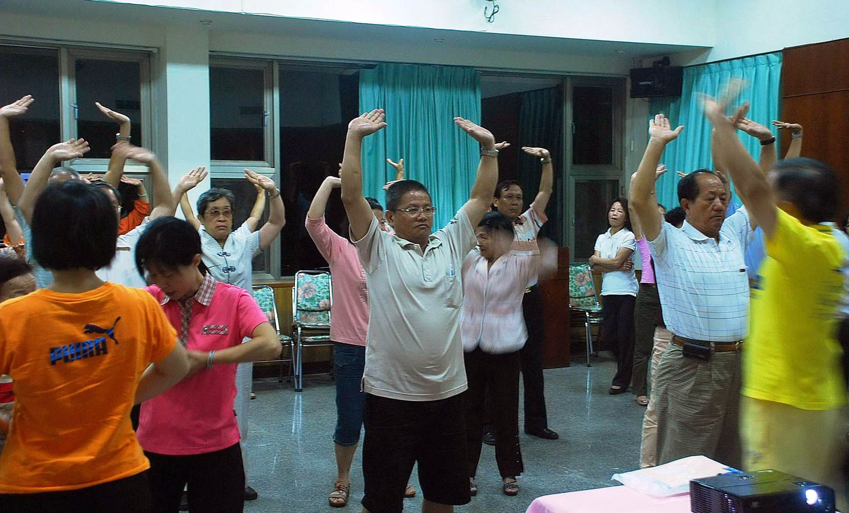 主办单位也安排法轮功学员教民众炼五套功法。在祥和的炼功音乐里,陈明贤、翁燕民认真地和大家一起学炼功法。