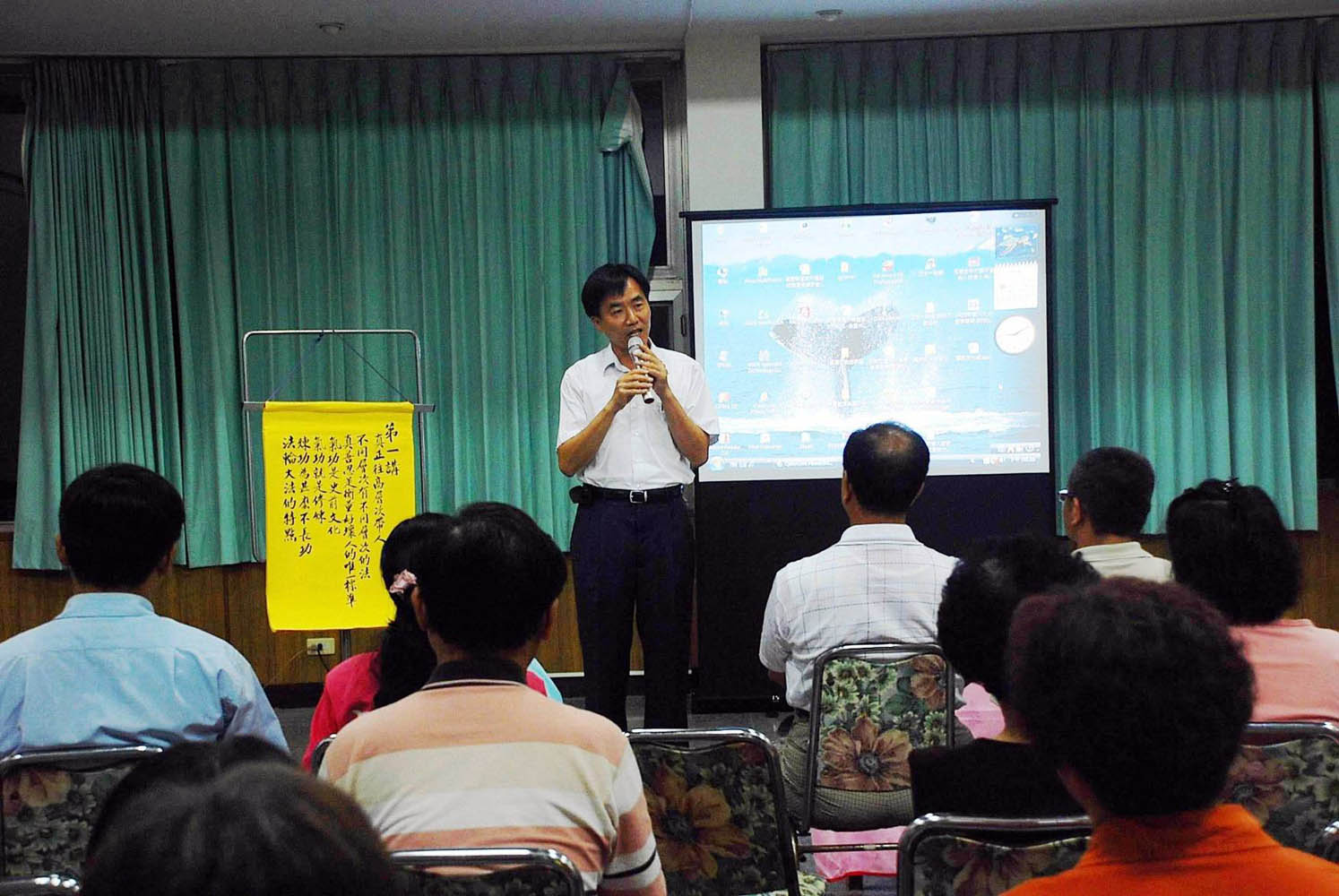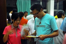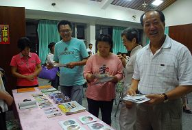 ![]() 会场上参加学习班的人们取阅法轮功简介,右一着白色条纹上衣者为HONDA汽车嘉义地区经销董事长翁燕民 |