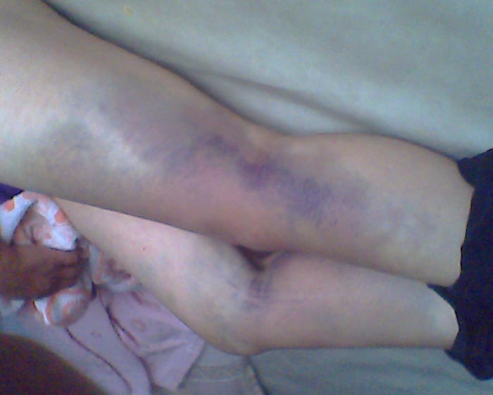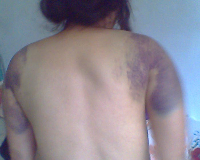 有一个警察点上烟,大口大口的往她脸上喷。所谓的警察们一拨一拨的换人,对这位善良的妇女连打带骂,用报纸卷成纸棍猛抽她的嘴、脸、头、双臂,报纸打烂了,再换了接着打。她的脸肿起来了,嘴也肿了。他们又用电棍电她的胳膊,电她的背;还强制她跪下,她不从,他们就使劲踢她的腿,直到她无力跪在地上。一个人用脚踩着她的腿,另一个人用胶皮棍打她的膝盖,然后又把她拉起来用带皮钉的胶皮棍猛抽她的臀部。