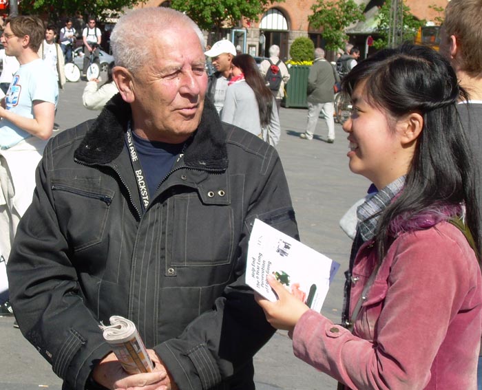 在了解法轮功是什么和法轮功被中共迫害的真相后,一些人萌生了要学功的念头。有两位丹麦妇女与学员交谈了很长时间,签名后并表示对法轮功很感兴趣,临走前记下了炼功地点和时间。