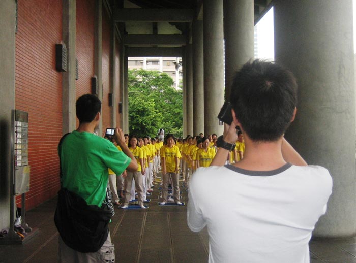 面对着连绵的阴雨,游客几乎都聚集在回廊,三三俩俩的,有的聊天有的拍照。在喧嚣中,法轮功的炼功队伍象磁铁般地吸引所有人的目光;炼功队伍中,不分老少,散发出的宁静、祥和气氛,在台风过境的夏日午后飘荡着。