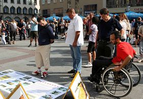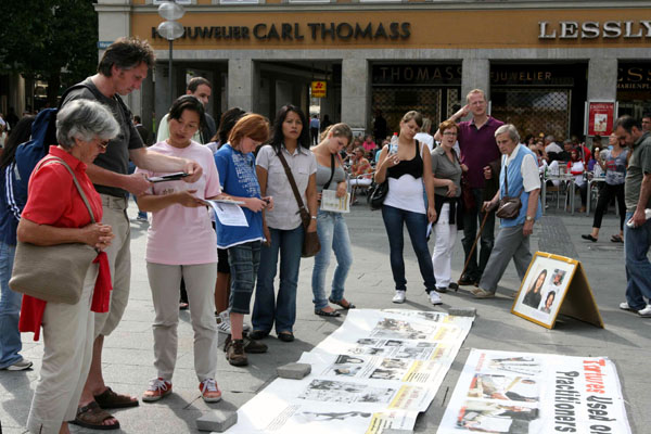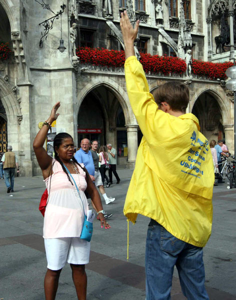 不少到慕尼黑旅游的中国人对法轮功学员的活动表现出很大的兴趣。两位来自河北省石家庄的老人长时间观看法轮功学员炼功,他们表示以前就知道法轮功好,但是共产党不让炼,还抓法轮功学员,让他们感到不可思议,这两位老人当场做了三:退.声明。