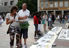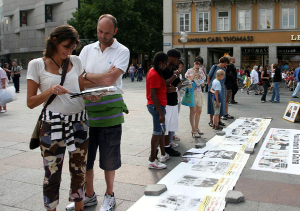 “看到这些有关活体摘取器官的图片,真是太恐怖了,让人无法理解,无论如何我们得制止这样的事情发生。”来自德国南部斯图加特附近的公务员怀瑟尔女士(Haeuser)对记者这么说,她刚刚在展台签名制止中共迫害法轮功。和她在一起的是机械师福尔克贝尔先生(Volker Beer),贝尔先生说:“我觉得必须清除共产党,尊重人权。可惜我们的政治家为了眼前的利益,为了金钱和权力,把人的权利和尊严放在第二位,真是遗憾。” 怀瑟尔女士接过话题:“人们根本就不知道这些事情,政治家也不谈论这些,看上去好象一切都那么美好,可如果人们把幕布掀开,就可以看到这些可怕的事情,这些事情令人毛骨悚然,令我十分震惊。”