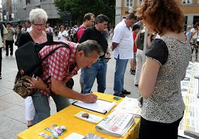 法轮功学员展示的优美的炼功动作和那些中共迫害法轮功的图片形成了强烈的对照,人们被中共迫害法轮功学员所使用的残暴手段所震惊,不少人表示,在当今文明社会里,怎么还会存在这种罪恶,许多人在制止中共迫害法轮功的签名簿上签名,也有人当场学炼功法,也有的打听炼功点信息。