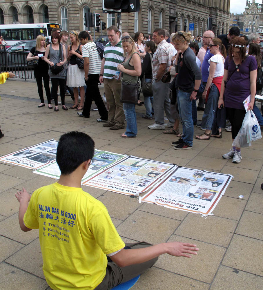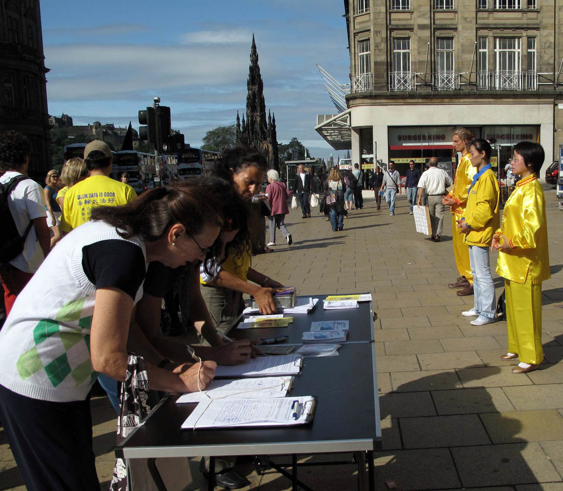 二零零九年八月八日至九日(周末),法轮功学员再次汇聚在爱丁堡,除了准备和参加艺术节开幕游行外,部份学员还直接走上街头讲真相。面对大法洪传世界以及法轮功十年来无辜遭受中共迫害的真相,很多人立即表态支持法轮功。