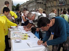 两天下来,法轮功学员们发现,在苏格兰,世道民风相对淳朴,人们在了解真相后也更能选择良知和正义。周六早晨在圣詹姆士小广场,法轮功学员们一开始炼功,就受到过往民众的关注,一些人在简单阅读法轮功被迫害传单后,立即在征签表上签字。