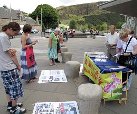 苏格兰议会大厦对面是苏格兰王宫所在地,国际游客多,其中包括寻找真相的有缘人。一对年轻人,看了迫害真相展板后显得很激动,他们要了各种真相资料,离开前对学员说“你们做得好,祝你们成功”。