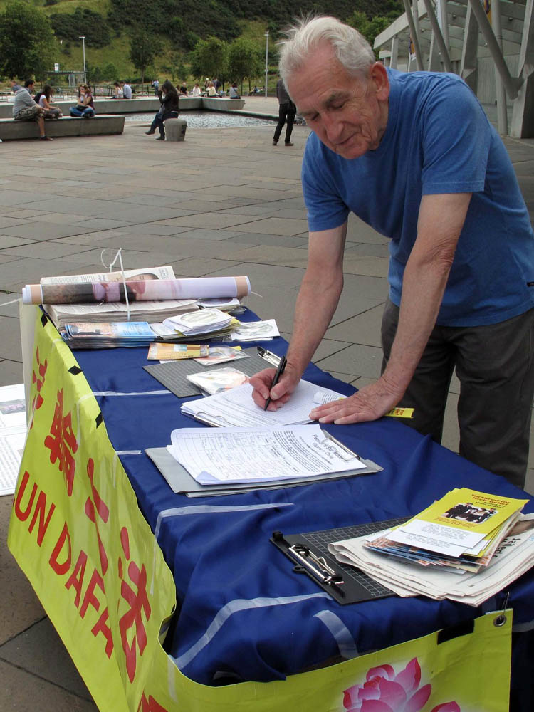 彼得是位苏格兰老人。他在签字后告诉记者他已经多次在爱丁堡游行中看到法轮功。说到迫害,老人说:“都这么长时间了(迫害还在继续),中共真是不可理喻。保证人的信仰自由应该是最起码的。”