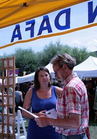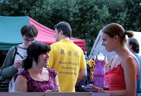 比利时妇女瑞塔(Rita)看过学员的功法演示后,告诉学员维费茨(Wilfried)说:“我很喜欢法轮功。我曾经读过一些佛教的书籍,知道身体与业力的事情。”当她听说这里有法轮功书籍时,马上购买《转法轮》和《法轮功》。她还表示回去后要上网了解炼功点的情况。