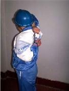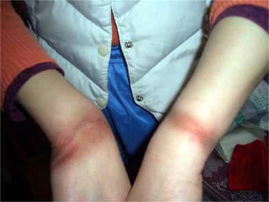 就这样,强迫我俩一直在冰冷的水里泡坐着三个多小时,过后又给我俩戴了三天的“背铐”,就是用手铐,将双臂从后背铐起,连晚上睡觉都不打开手铐。同监室的几个大法弟子也都曾经被强行“背铐”。这种“背铐”酷刑是将法轮功学员的双手反铐在背后,让学员面壁而站,有时还被迫戴安全帽,恶警用电棍电击法轮功学员的手臂。几分钟后,整个胳膊都不会动,像脱臼一样痛苦,手铐勒進肉里,手臂全都肿了起来,胳膊失去知觉。