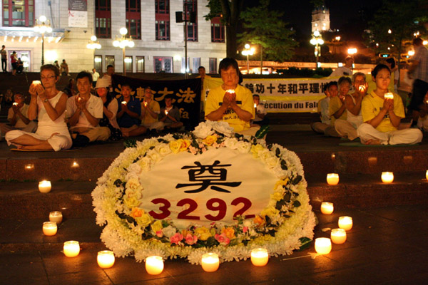 夜幕降临,法轮功学员燃起烛光,悼念因不放弃“真善忍” 信仰而被中共迫害致死的法轮功学员。庄严肃穆的会场感染着围观的人们,他们静静地听着主持人介绍法轮功学员遭受的迫害,直到主持人宣布活动结束。