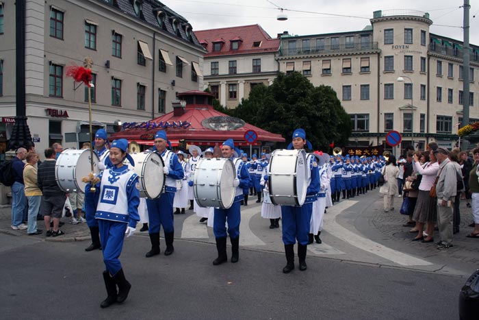 ![]() 法轮功游行队伍整齐地走在哥德堡最繁华的大道上 |