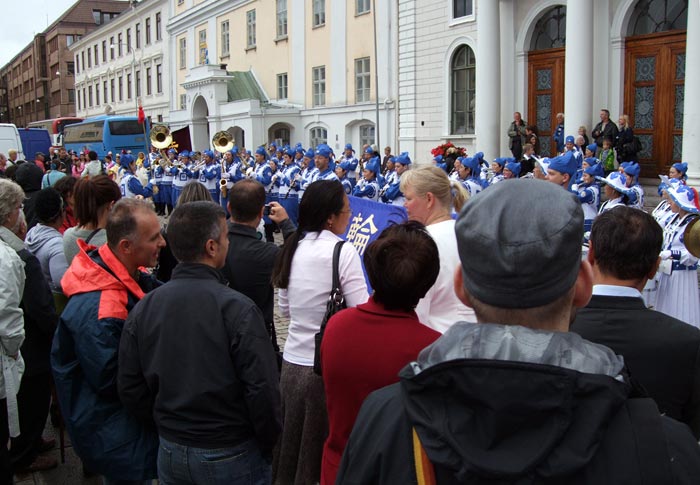 ![]() 瑞典民众驻足观看天国乐团的表演 |