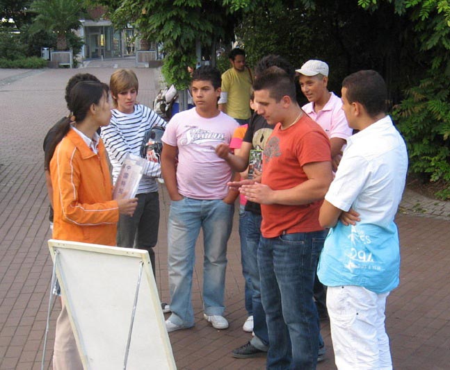【明慧网二零零九年八月十八日】夏日午后的阳光暖暖地照在身上很舒服,许多年轻人在绿色的草坪上休憩,尽情享受着这在德国并不常见的好天气。一段舒缓悠扬的中国音乐隐约从草坪的一端响起,几名法轮功学员在音乐中安详地打坐,吸引了许多人的目光。