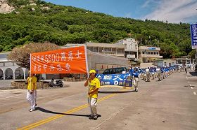 抵达观光景点北竿芹壁村,在湛蓝大海的对岸,隐隐浮现连绵不绝的山峦,正是中国大陆福建。游行队伍顶着艳阳、挥灑着汗水,藉由《法轮大法好》与《送宝》等乐曲,就是要告知对岸民众,把握良机,“退!党!保平安”。