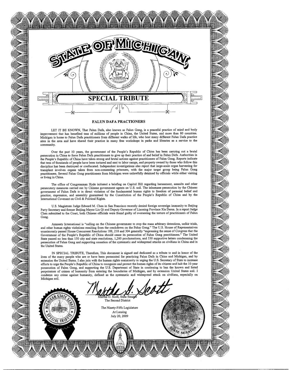 【明慧网二零零九年八月二日】二零零九年七月二十日,美国密歇根州第二选区参议员马莎•G•斯科特(Martha G Scott)对反中共迫害十年的法轮功学员们签发了一封特殊感谢信(Special Tribute),表示“将其作为对那些在中国和密歇根州,以及全美国因修炼法轮大法而被(中共)迫害的人们的一种礼赞,并向他们表示特别敬意。”