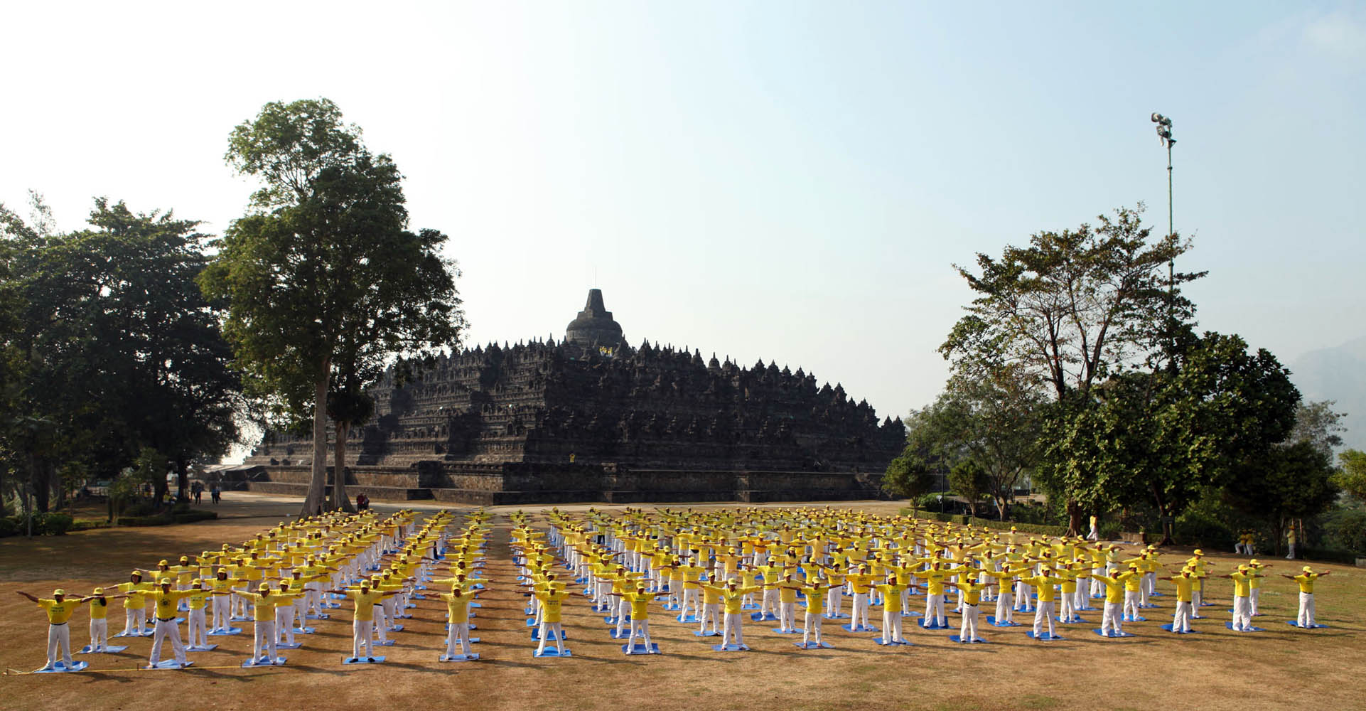 法会结束后第二天一早,学员们集中到日惹城北四十公里处,始建于西元八世纪后期的世界现存最大古佛塔——婆罗浮屠(“婆罗浮屠”,Borobudur,在古梵文中的意思是“山丘上的佛塔”)的大草坪上,排出“大法”两个字,并集体炼功。