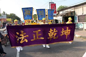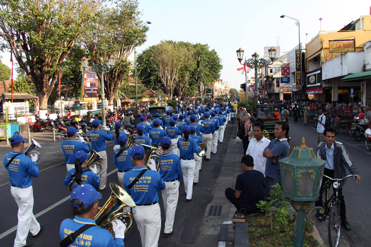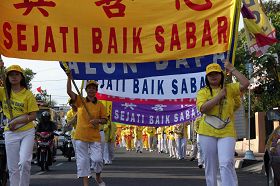 来自新加坡和马来西亚的大法弟子组成的天国乐团走在最前头,紧随其后是“法轮大法好”、“生命需要真善忍”等旗帜方阵,还有腰鼓队、花车和炼功等方阵,壮观的场面震撼着日惹这个一百五十万人口的城市。