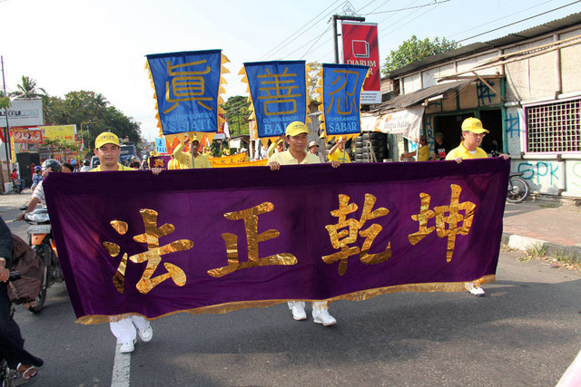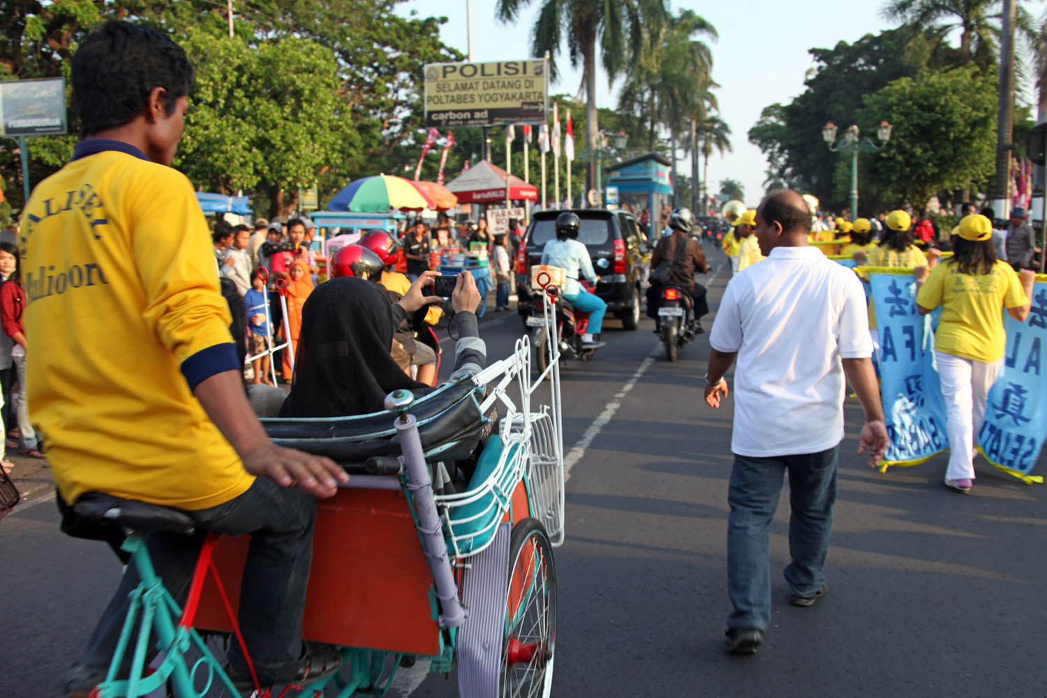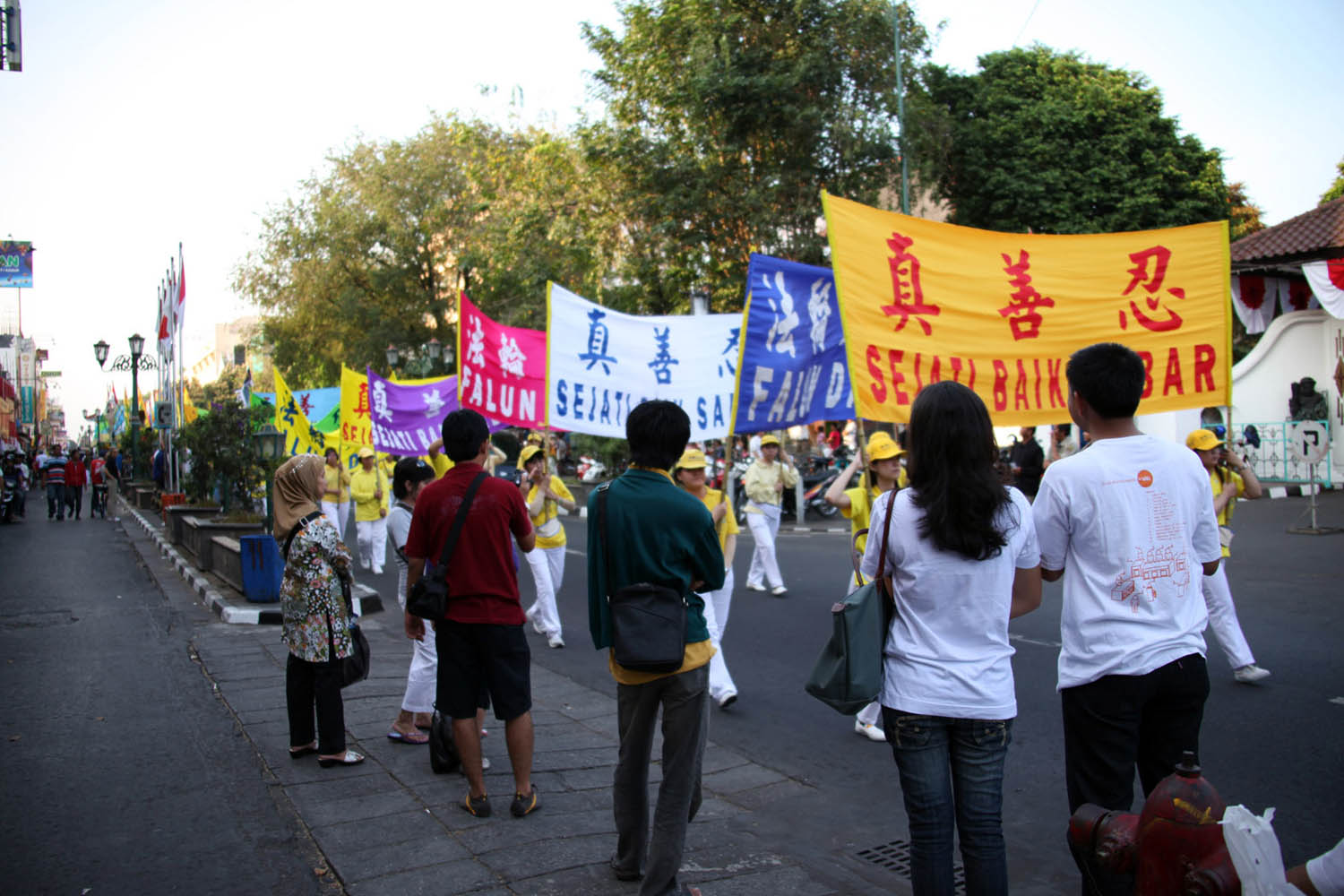 法会的前一天下午,与会的大法弟子参加了主题为“法轮大法好”的盛大游行,沿着日惹市最繁华、位于市中心的玛丽欧•波罗大街绕行一圈。